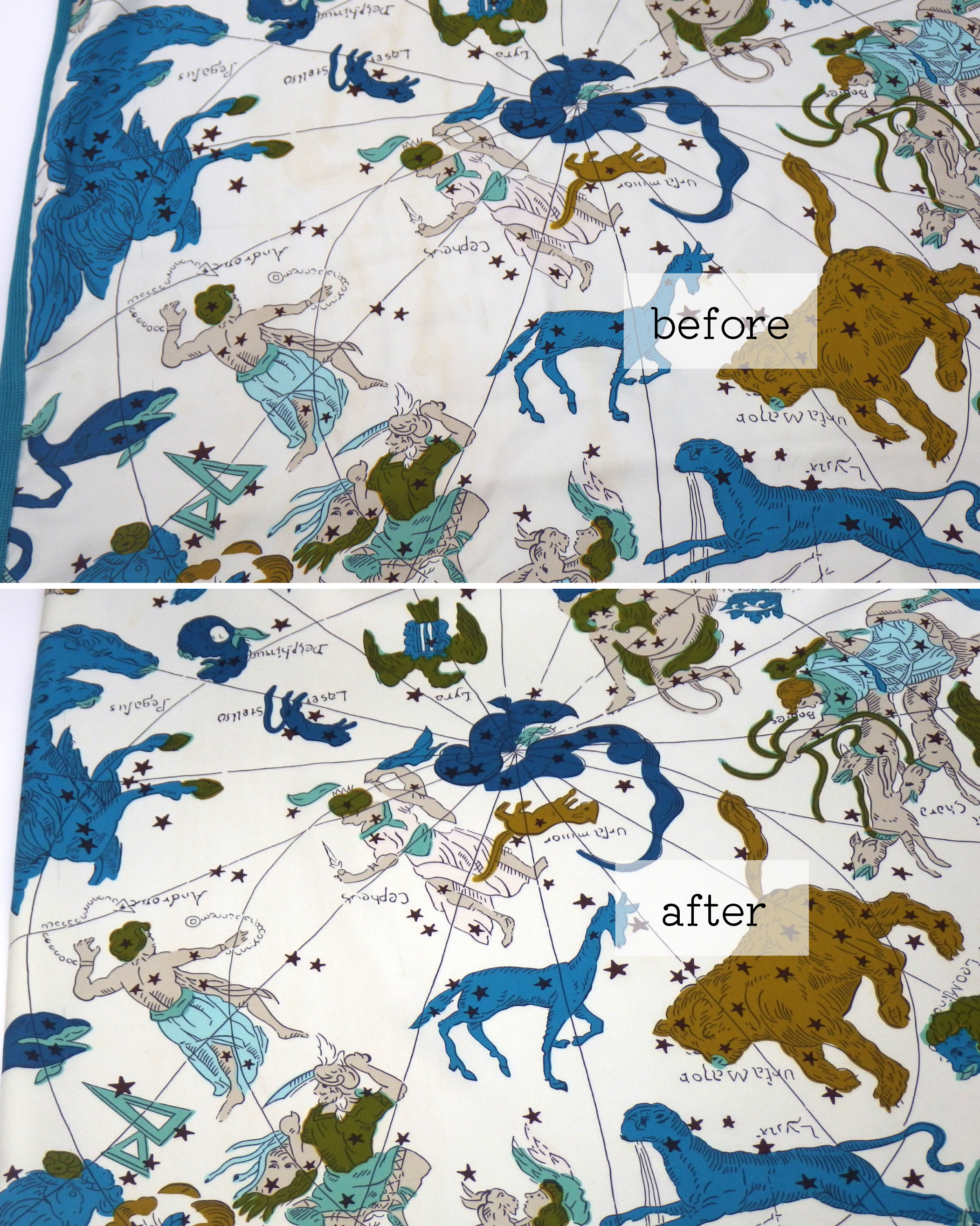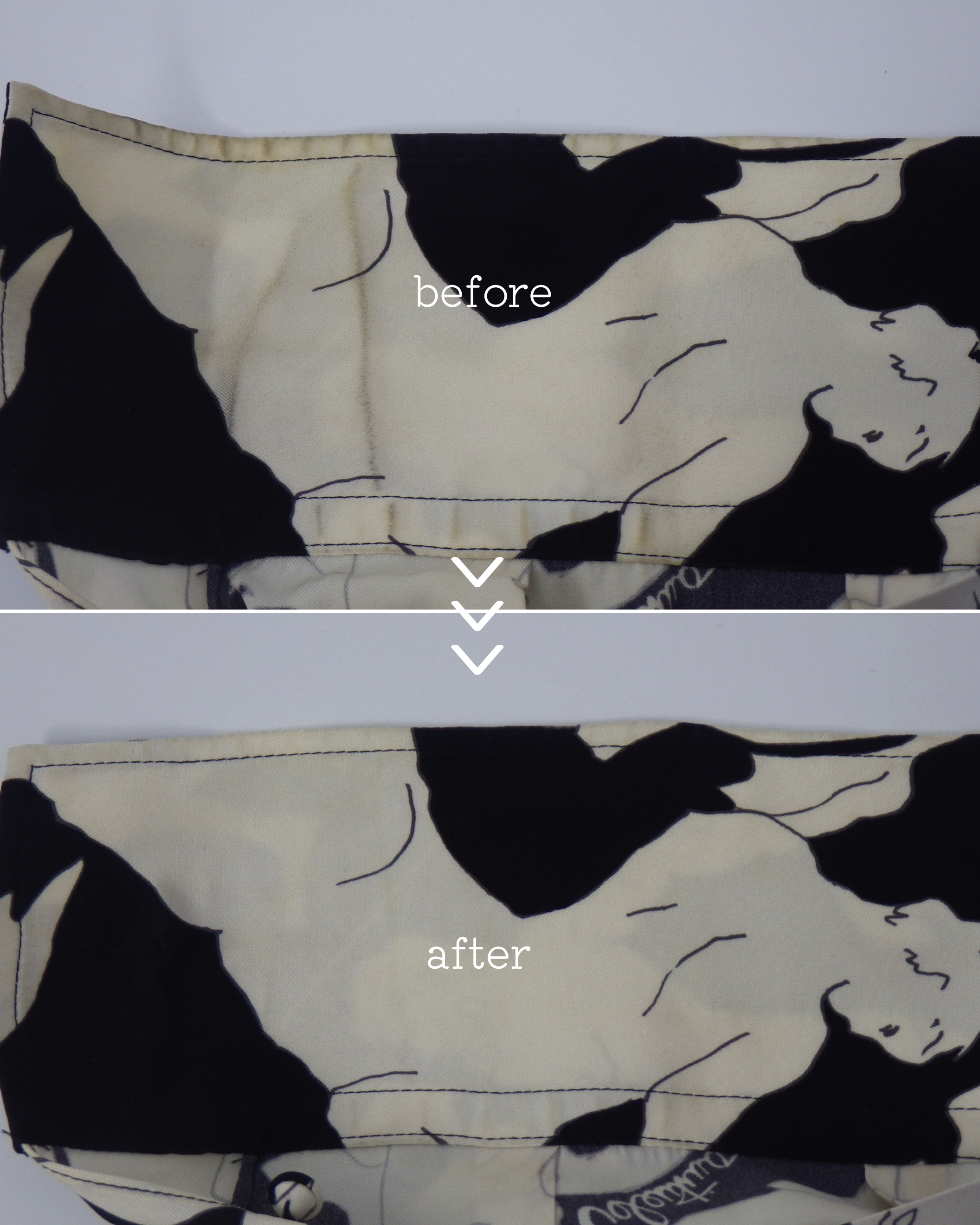 白化しやすい素材ですが問題なく「ケアメンテ」でシミ汚れはスッキリ!