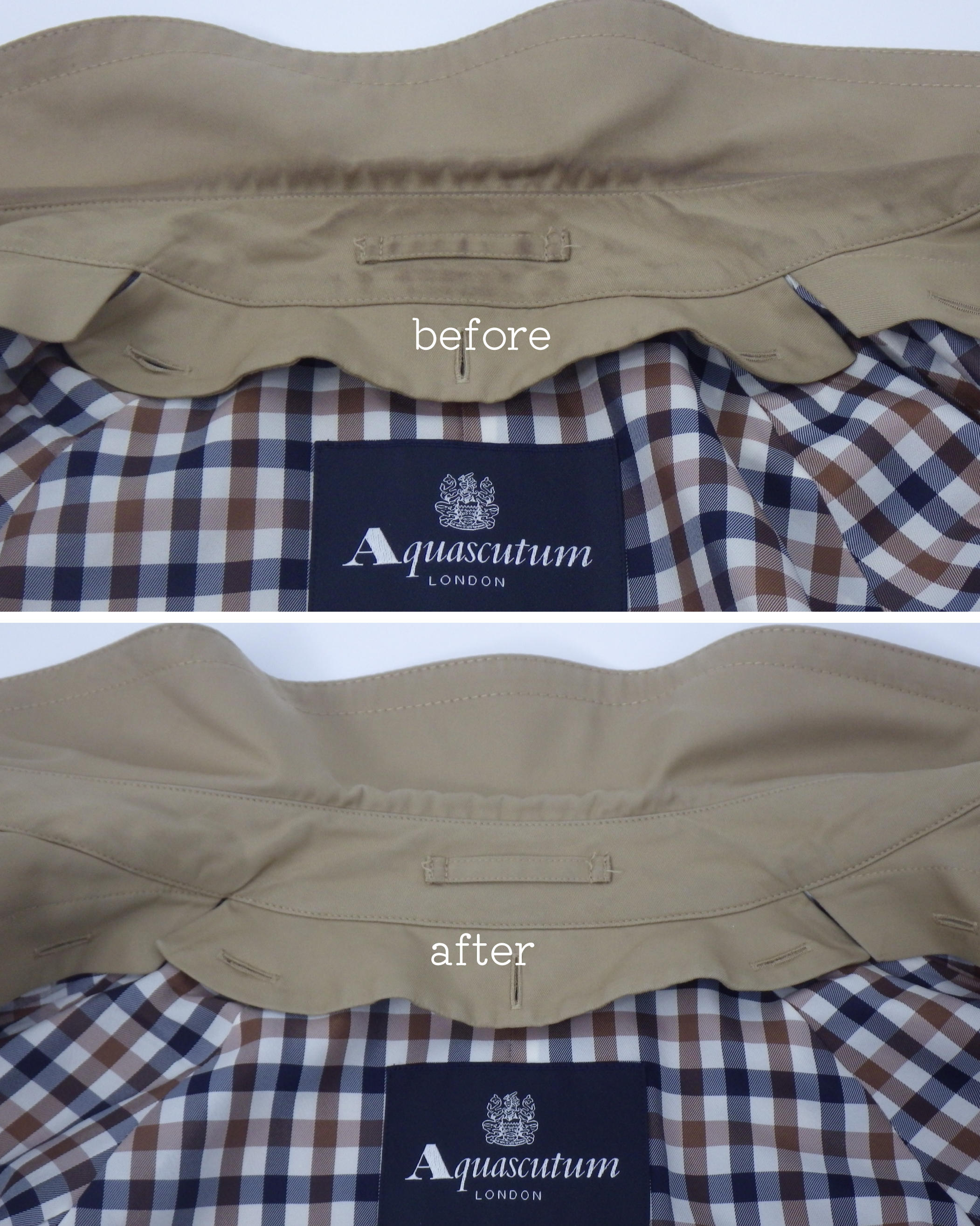 襟などのシミ抜き跡が大きな輪ジミになってお困りだったジルサンダーのジャケットを、ハッピー独自のリプロン技術できれいに再生しました☆