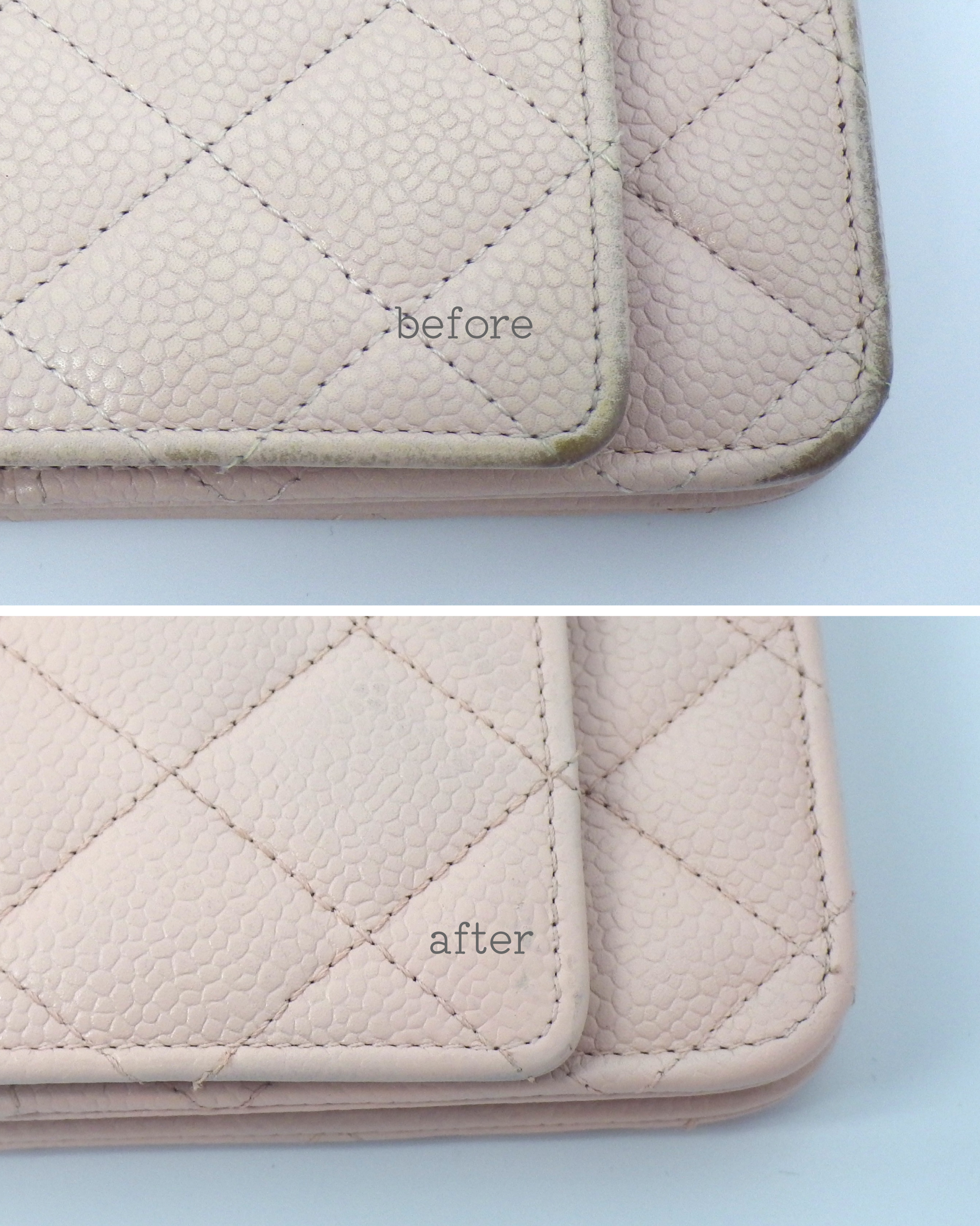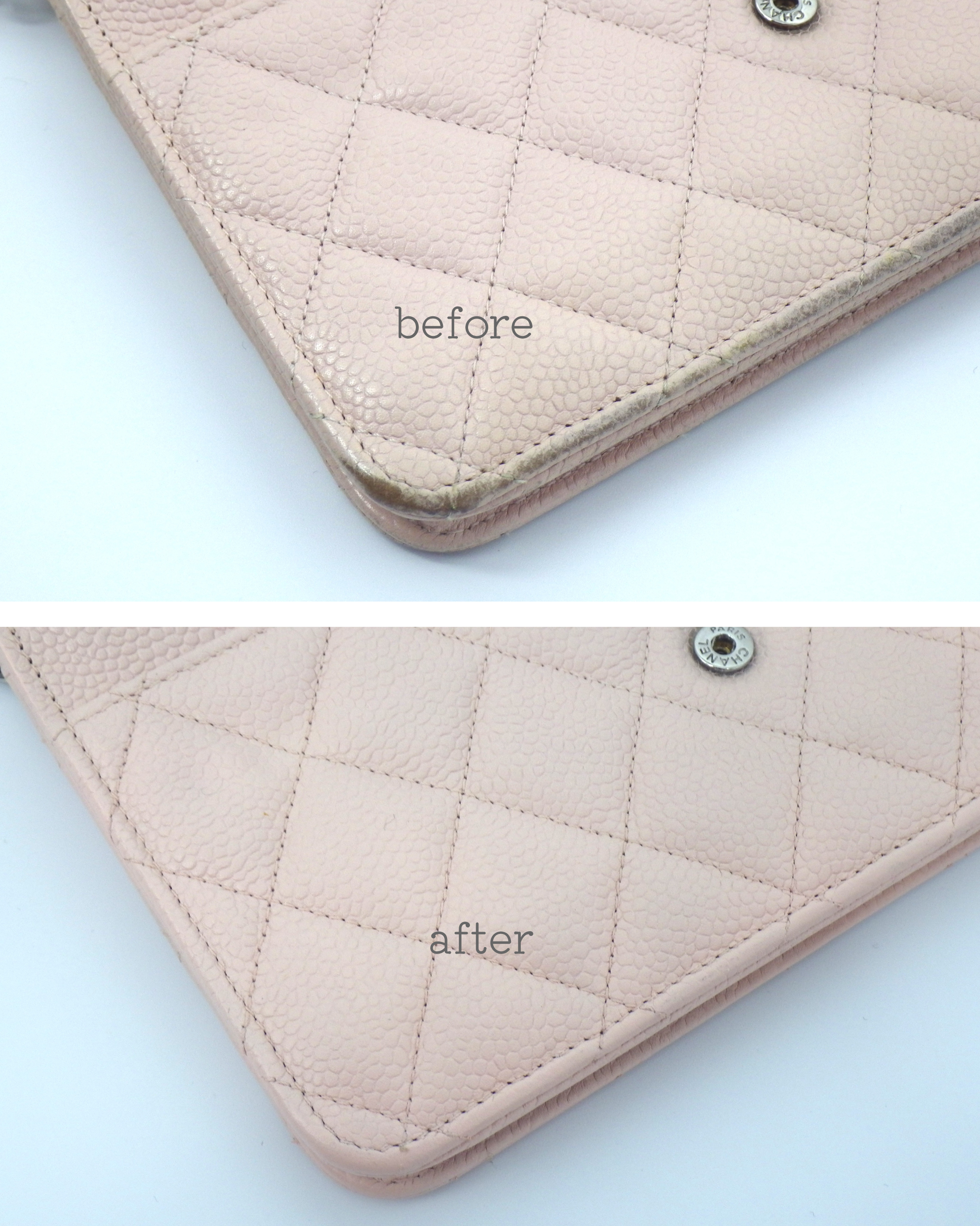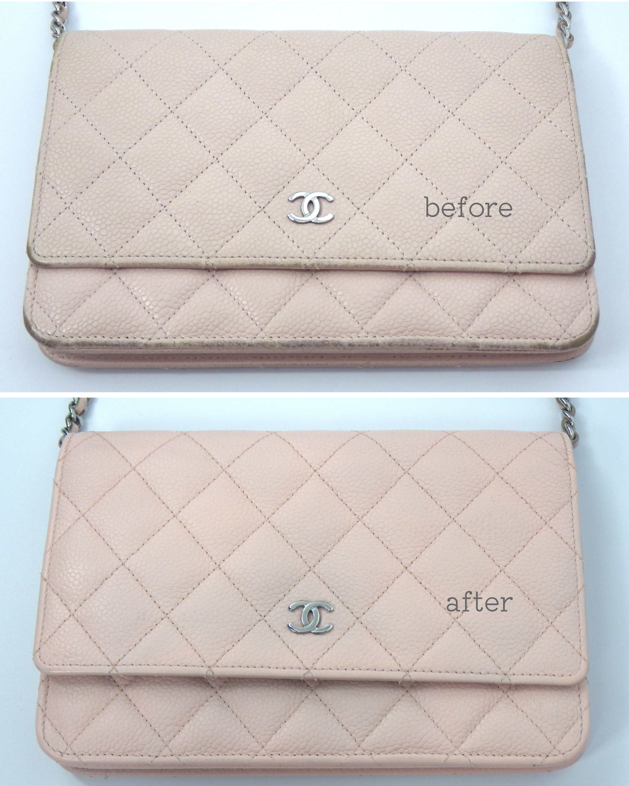 ご依頼時は、長年のご使用により、可愛らしい薄ピンクカラーが全体的に黒ずんで摩擦による銀面の剥げ落ちも目立っていた状態でした。