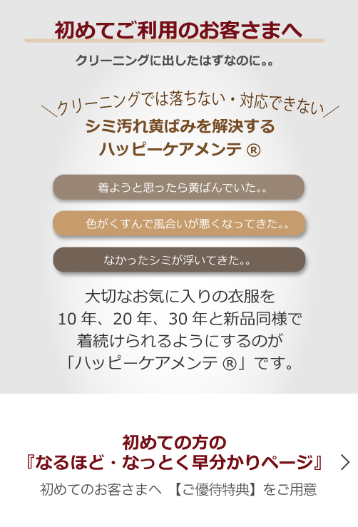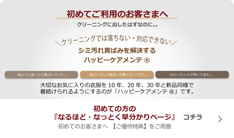 クリーニングは、シミ・汚れ・黄ばみ・変色、風合いをキレイに「出来ない」ので、衣類・衣服の寿命が短命化して「困っている」という難題を多くの消費者から相談を受けて、「ハッピーケアメンテ®」は、キレイに「出来る」洗浄技術で新品同様を維持し、衣類・衣服を長命化して百年単位で着続けられるようにしました。それがクリーニングの駆け込み寺「ハッピーケアメンテ®」の真価です。つまり、お洒落なファッションを思う存分楽しめる高級クリーニングの先をゆく「ハッピーケアメンテ®」です...続きはコチラ