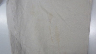 広範囲に飲み物のシミや黒ずみ汚れが付いていたインコテックスの綿ズボンです。無重力バランス洗浄を用いた水洗いとリプロン技術でスッキリ!
