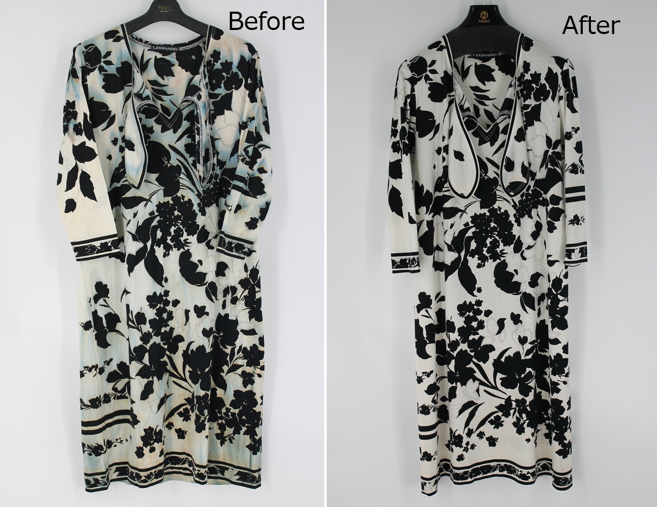 「世界で最も美しいプリント」と称され、世界中の女性たちから世代を超えて愛され続けているレオナール。家庭洗濯で柄から全体に色移りしたワンピースをリプロン「色移りクリア」で再生しました!