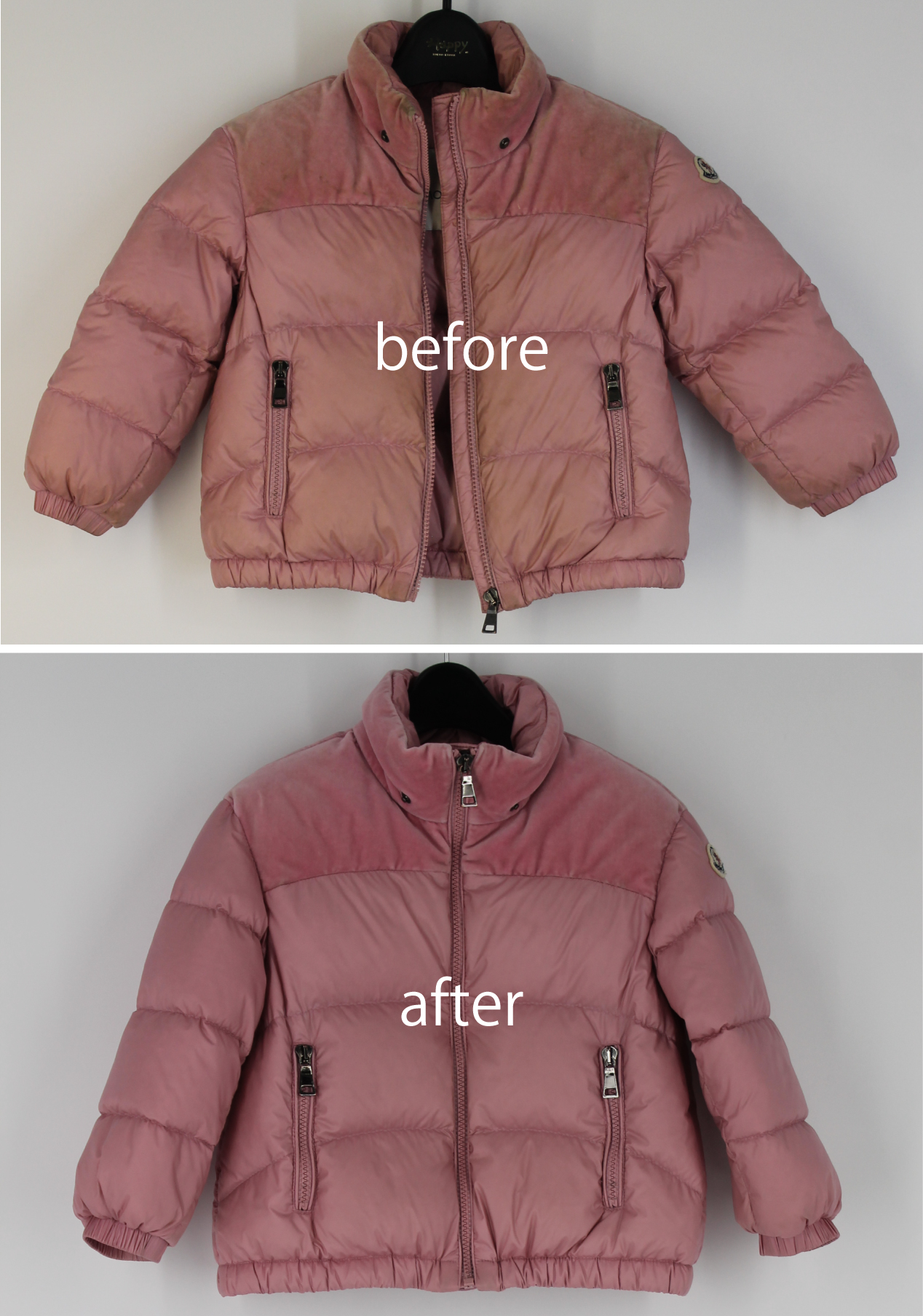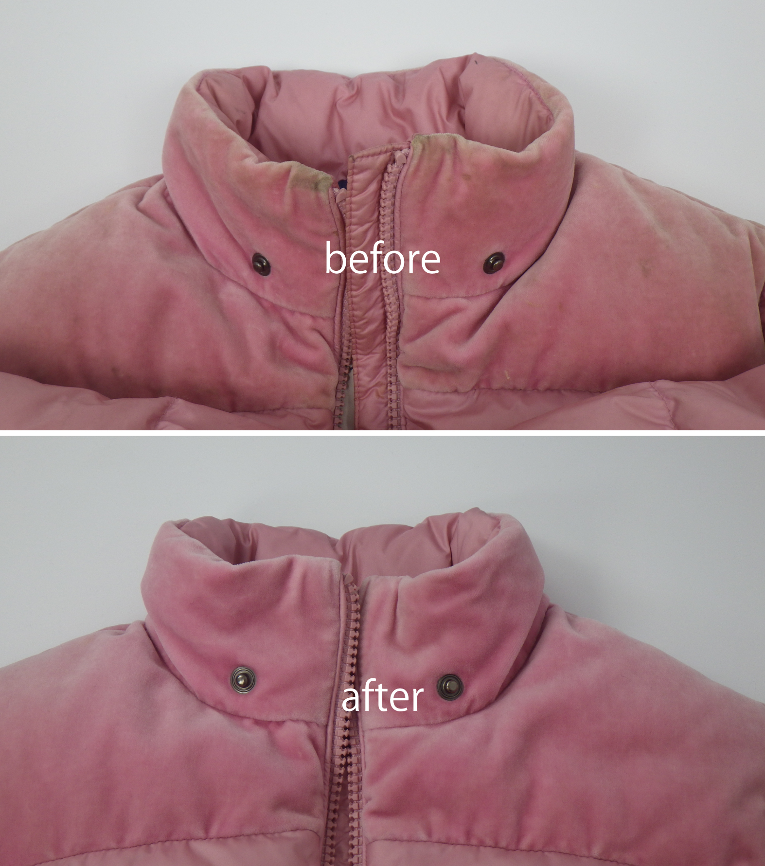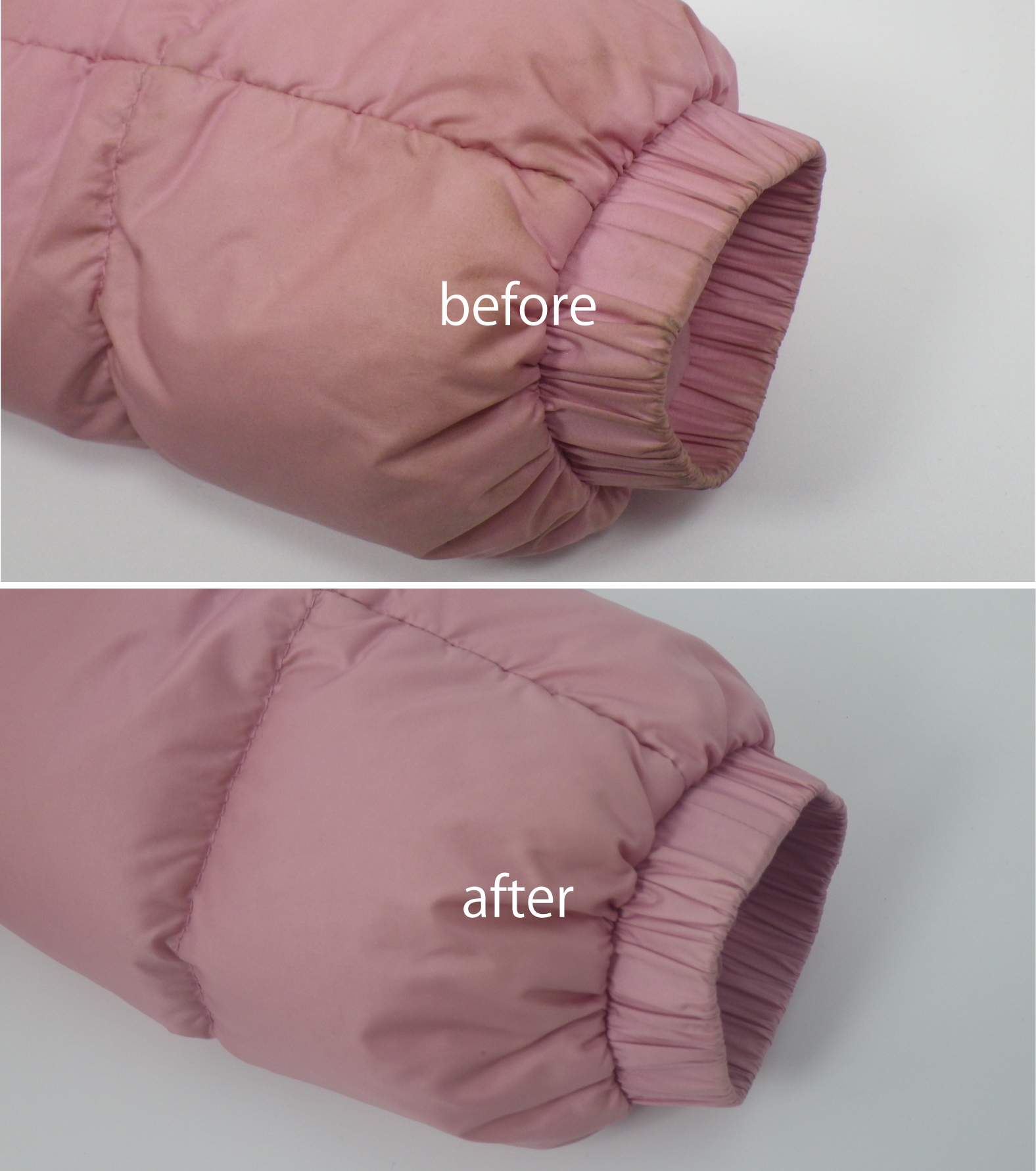 活用頻度の高いダウンアウターは汚れが蓄積しやすく、特に襟や袖口などの皮脂汚れや黄ばみ・黒ずみなどが一般的なクリーニングではなかなかスッキリしないとお悩みのお客様が多くいらっしゃいます。