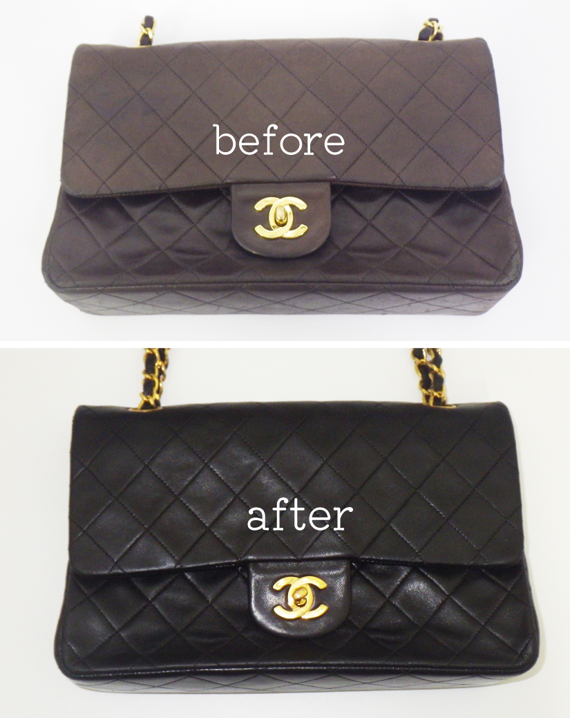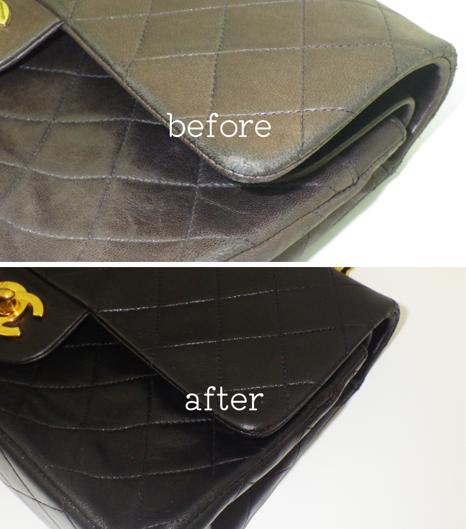 長年の使用で全体が色あせて、ブラックからブラウンに変色していましたが、レザー製品の銀面の剥げや色あせなどを復元・再現するハッピーの独自技術「レザーグレイン再現加工」によって、新たに命が吹き込まれました☆