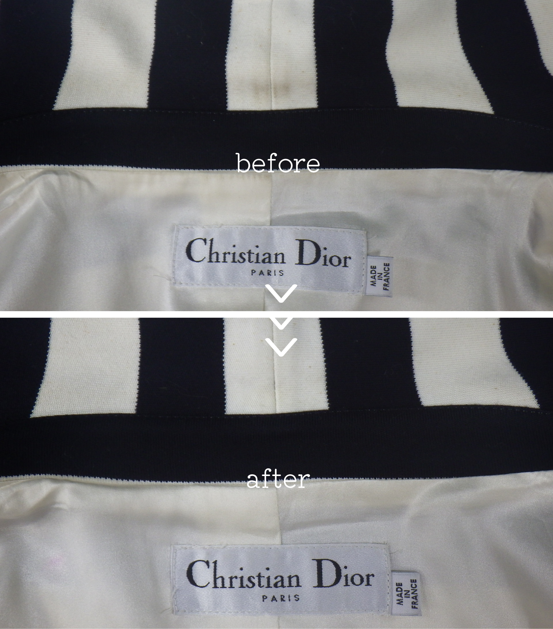 しかし、強いコントラストの色合いに加え、表地がコットン、裏地がシルクとポリウレタンの混紡素材であるため、水洗いによるメンテナンスが非常に難しいというのも事実。とはいえ、ドライクリーニングだけではシミや汚れを完全に落とすことはできず、着用を重ねるごとに薄汚れ、風合いもくたびれててしまい、ディオールのブランドコンセプトである「エレガンス」が損なわれてしまうことも否めません。