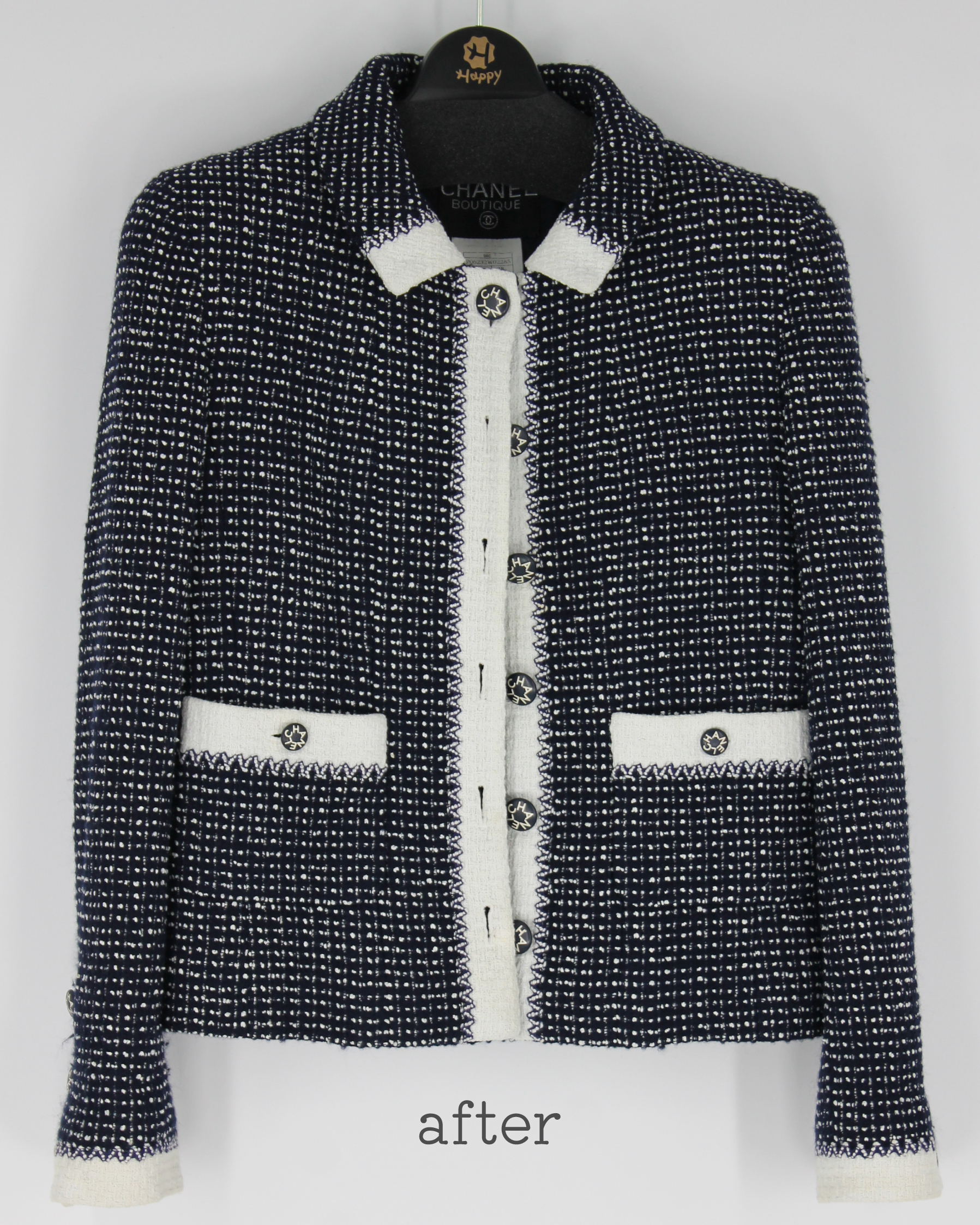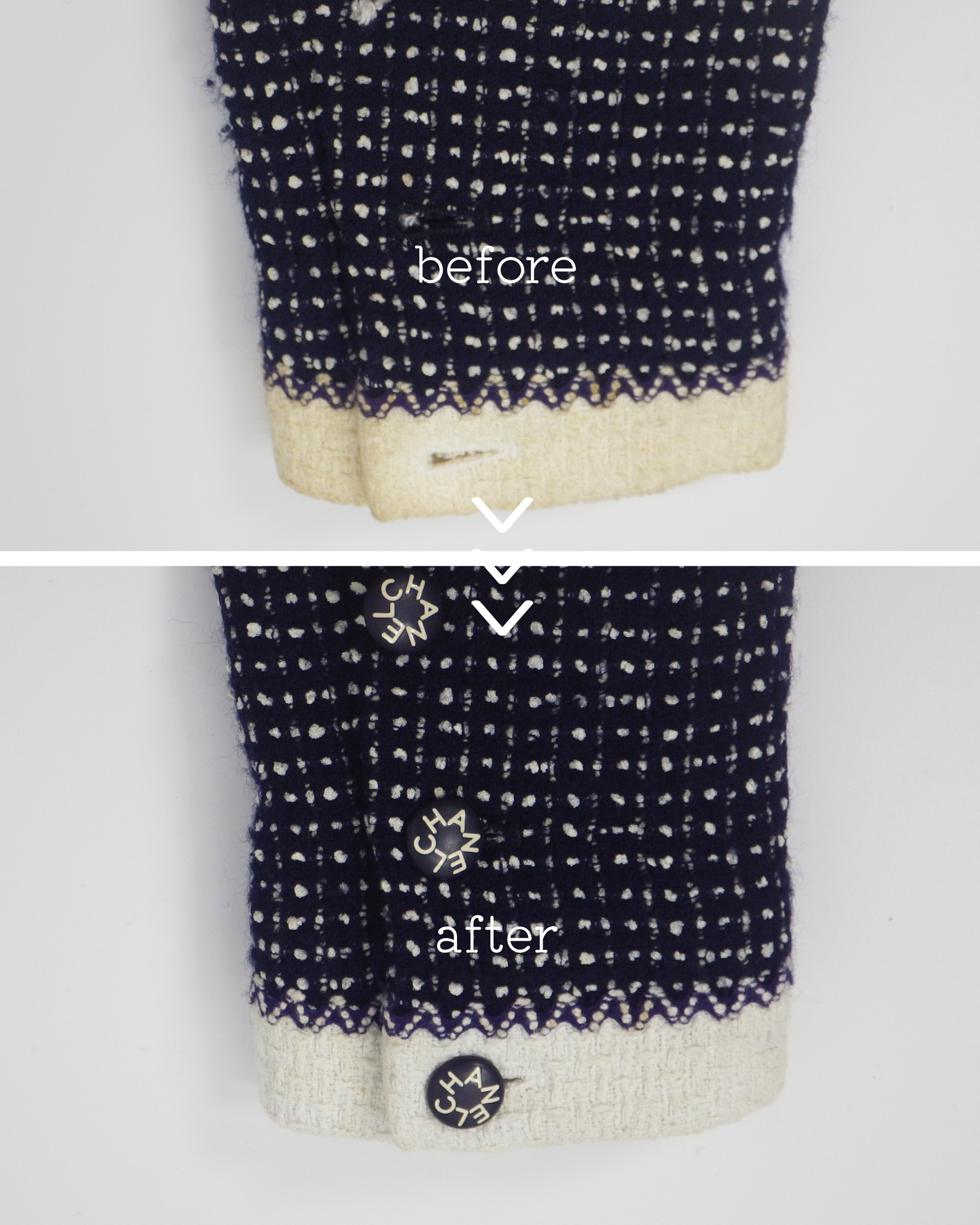 芸術品ともいえる貴重なシャネルのボタンは、必ず洗浄前に取り外して処理後に元通り付け直しさせていただいております。