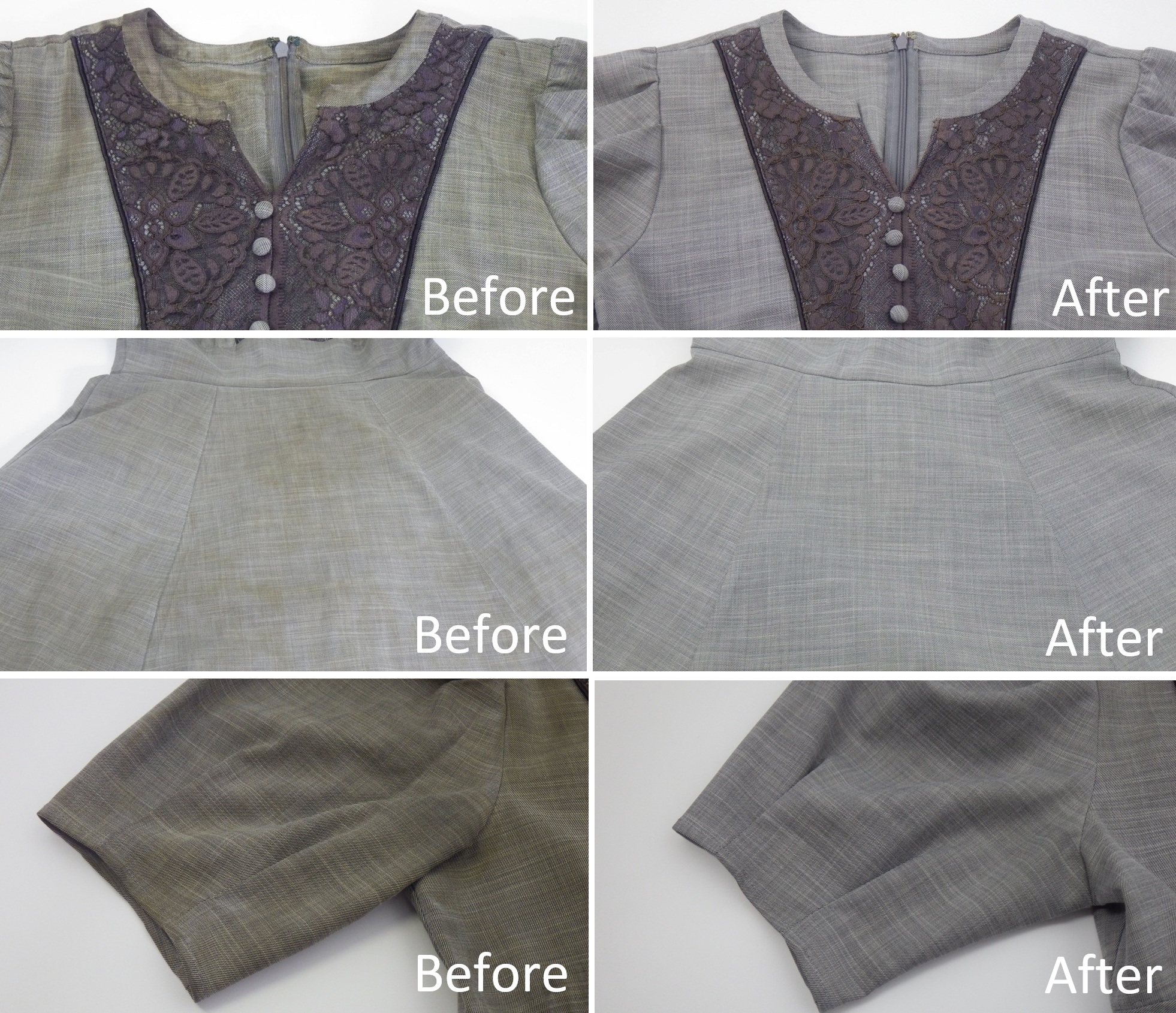 シミ汚れや黄ばみが全体まだらに付着していたレース使いのワンピースを新品同様に再生しました!