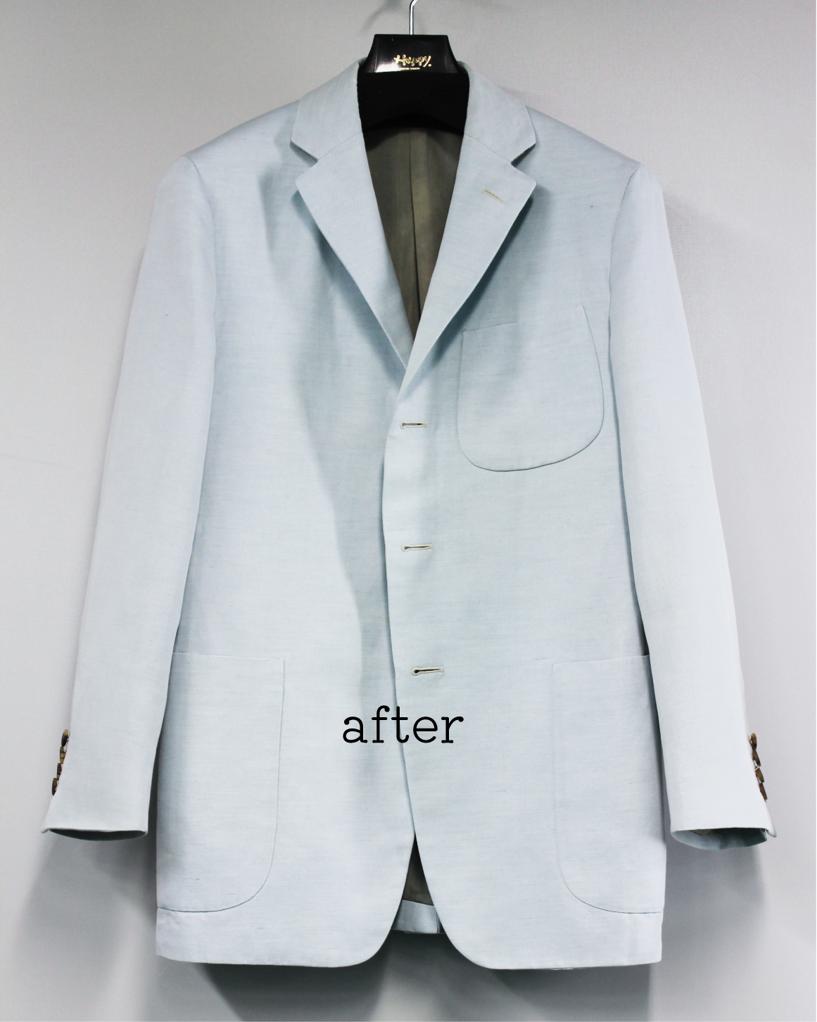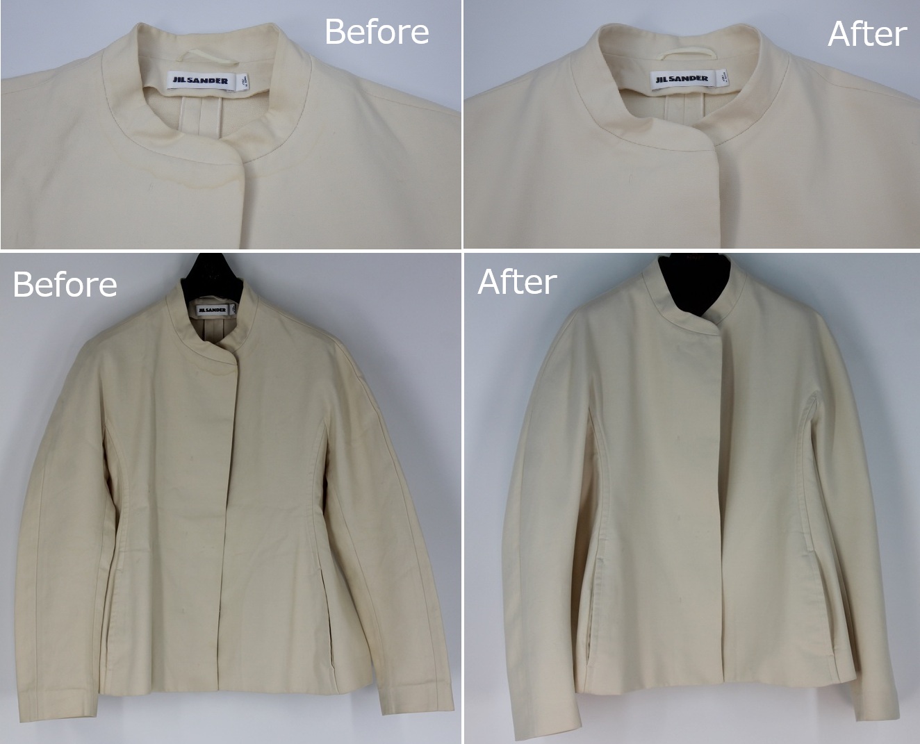 襟などのシミ抜き跡が大きな輪ジミになってお困りだったジルサンダーのジャケットを、ハッピー独自のリプロン技術できれいに再生しました☆