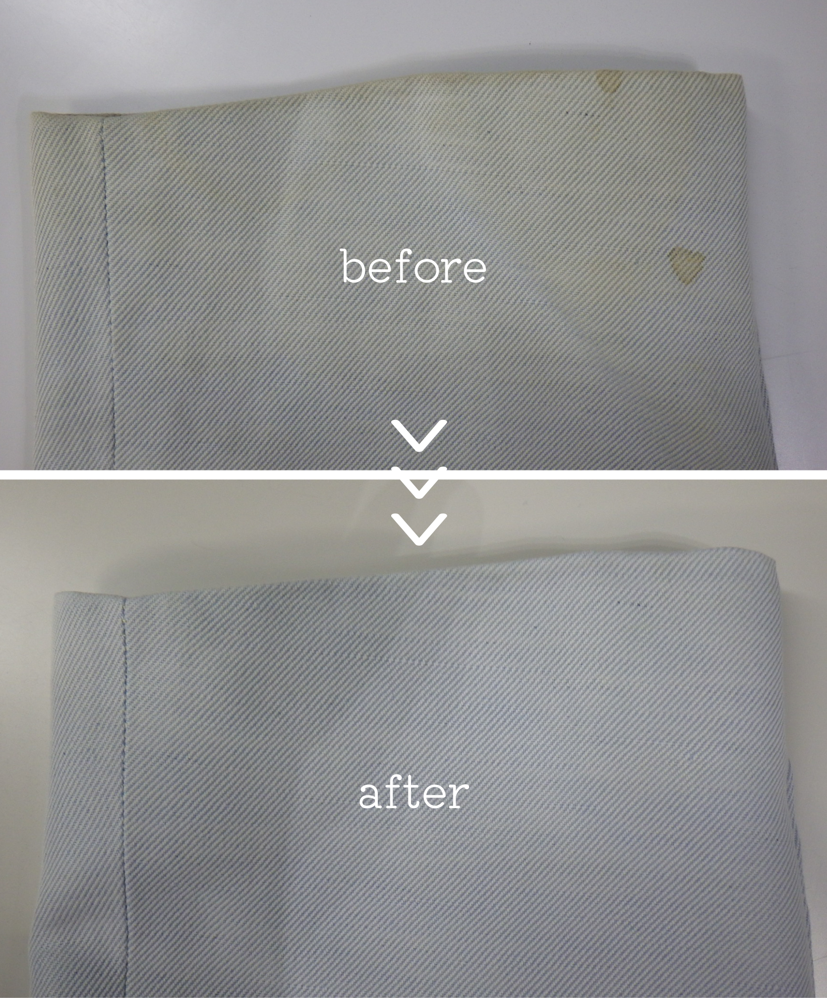 白化しやすい素材ですが問題なく「ケアメンテ」でシミ汚れはスッキリ!