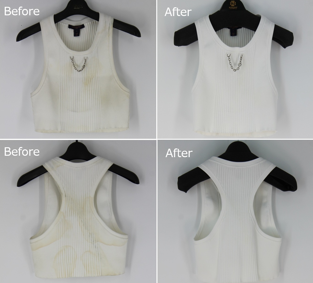 定期的なケアは黄ばみを防ぐハッピーの基本洗浄『アクアドライ』、さらに、既に黄ばんでしまっている場合は『リプロン』の黄ばみ取りやシミ汚れ落としを組み合わせる処理が効果的です☆